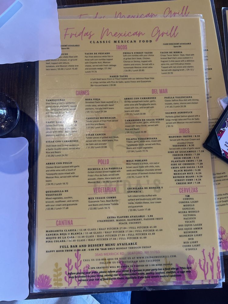 Frida's Mexican Grill is a Latin American restaurant located at 3545 Merrick Rd Seaford, NY 11783. The menu offers a variety of Tex-Mex and Mexican dishes, with options for vegans and limited vegetarian choices. Featuring a cozy atmosphere with attentive service, Frida's is known for its tableside guacamole, tortilla soup, and perfectly cooked steak. Customers have raved about the authentic Mexican flavors, excellent service, and delicious dishes such as the Aguacate Relleno, Ceviche de Pescado, and Chimichangas. With options for outdoor seating, private dining, and catering services, Frida's is a must-visit for those looking for a memorable dining experience. Whether you're in the mood for fajitas, burritos, or empanadas, Frida's Mexican Grill has something for everyone to enjoy.